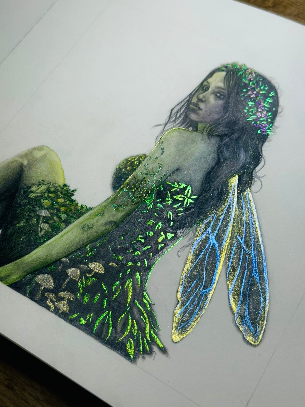 Many of my artworks look matte at first glance, but shift the angle and colour comes to life. I make colour-shifting paints by hand, to weave a little magic into every piece of art.